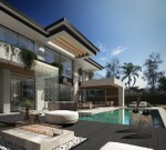 El área exterior incluye un jardín con una piscina de diferentes profundidades, un Pool Bar, una cascada desde la terraza y un área de comedor cubierta. La planta superior alberga un dormitorio principal con vestidor y baño en suite, y dos dormitorios adicionales en suite. El solárium cuenta con su propia piscina y área de barbacoa.
