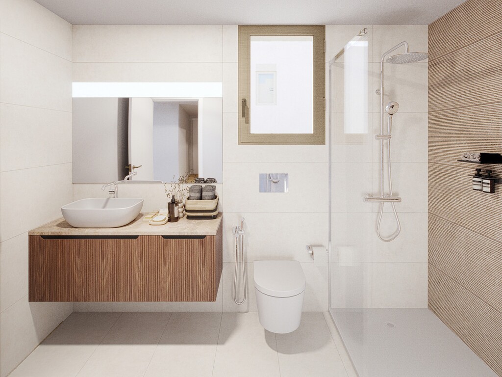 Se utilizan materiales de alta calidad en toda la vivienda, incluyendo suelos porcelánicos de gran formato, suelos laminados de madera en los dormitorios y calefacción por suelo radiante en los baños. Las viviendas se distribuyen en varios niveles, con opciones como ascensor privado, piscina, paneles solares, dos plazas de aparcamiento privadas y amplias zonas de almacenamiento.